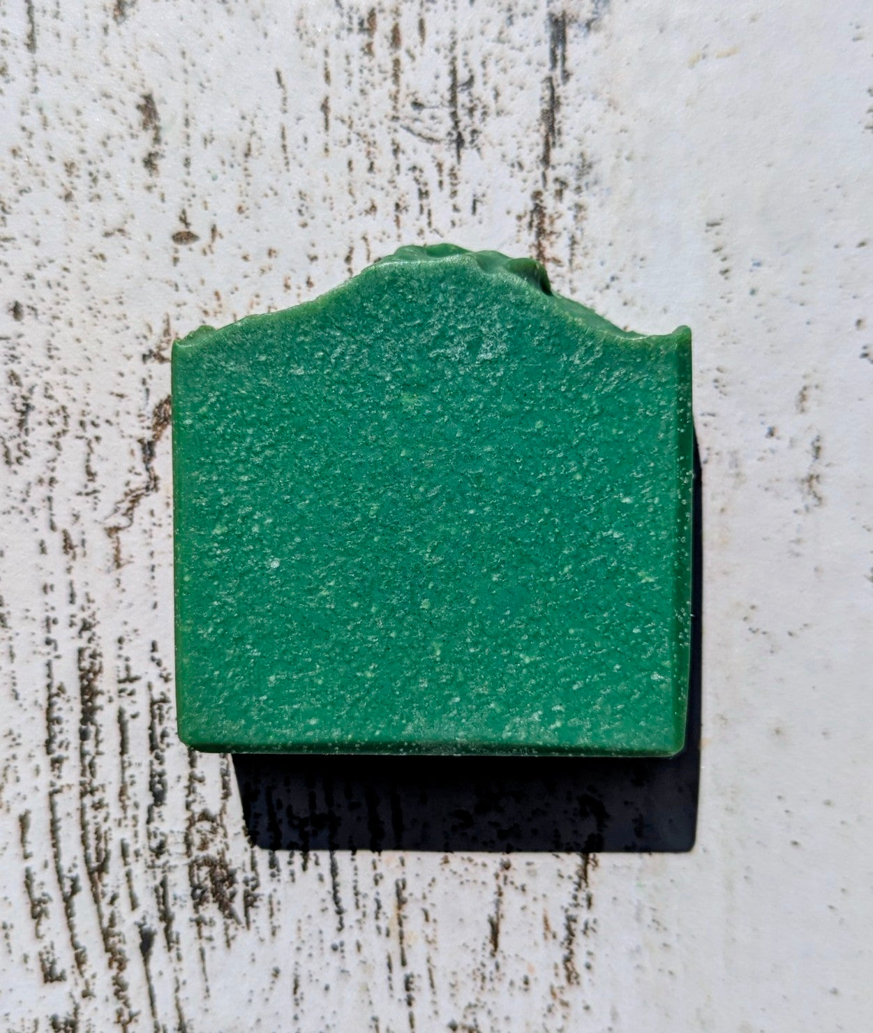 Plant based Merry Christmas cold process soap bar made with green micas and Christmas Tree fragrance oil. This is a natural soap bar with beveled edges made for comfort and has a nice lather. Use with a draining soap dish to make soap last longer. Packaged in a recyclable paper band. Size varies for each bar. Approximately 4 oz